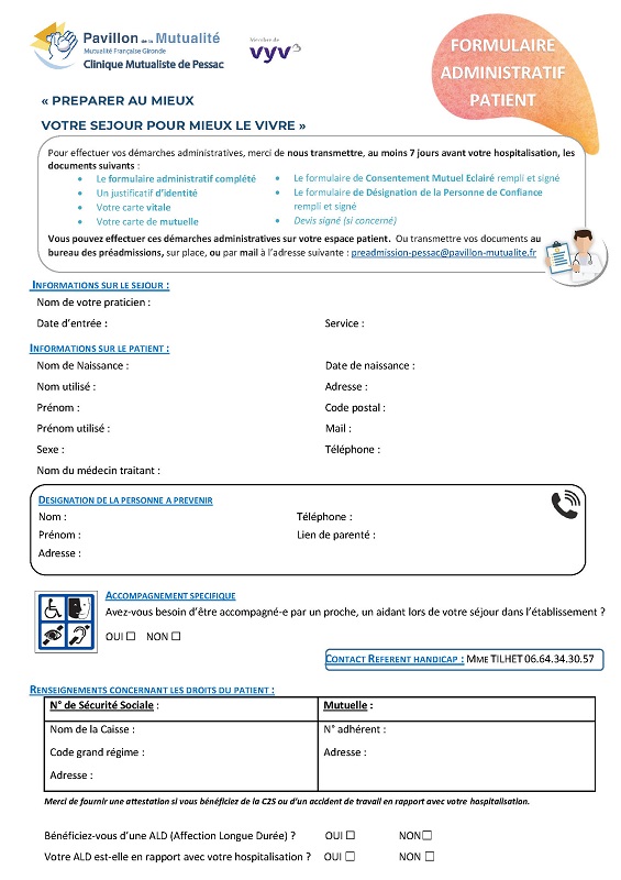 Vous venez de consulter le spécialiste et/ou l'anesthésiste en vue de votre intervention ? Afin de préparer au mieux votre séjour, vous devez réaliser vos démarches administratives, soit en vous connectant à votre espace patient, soit en vous présentant au bureau des préadmissions au moins 7 jours avant votre hospitalisation.